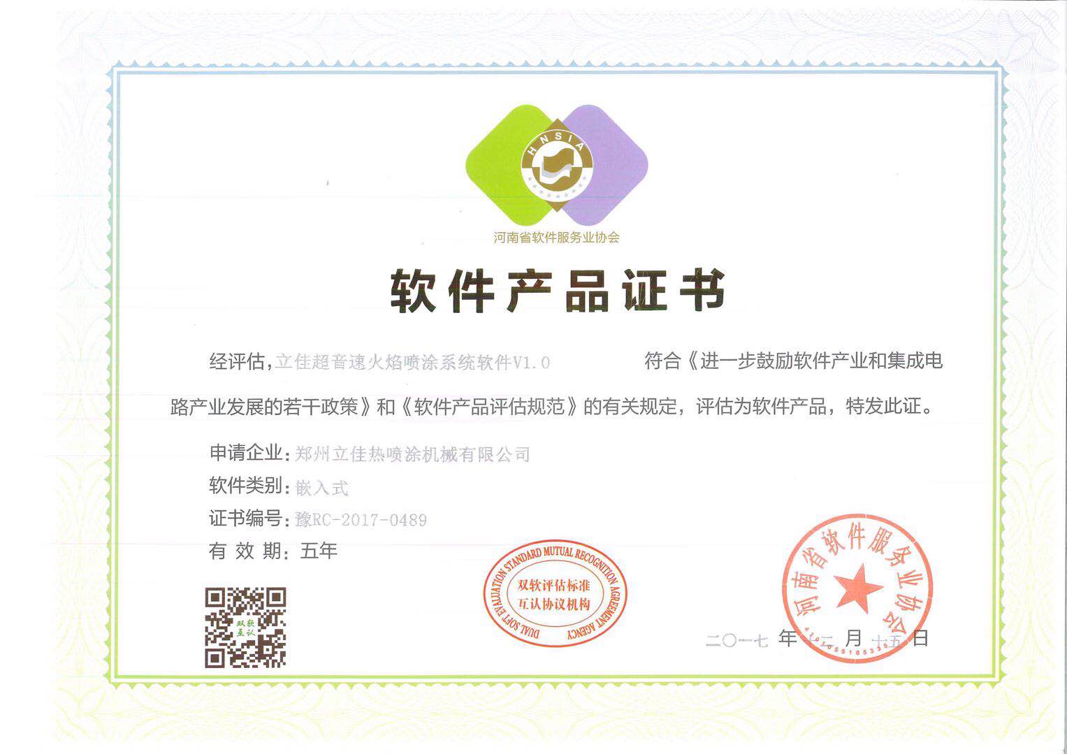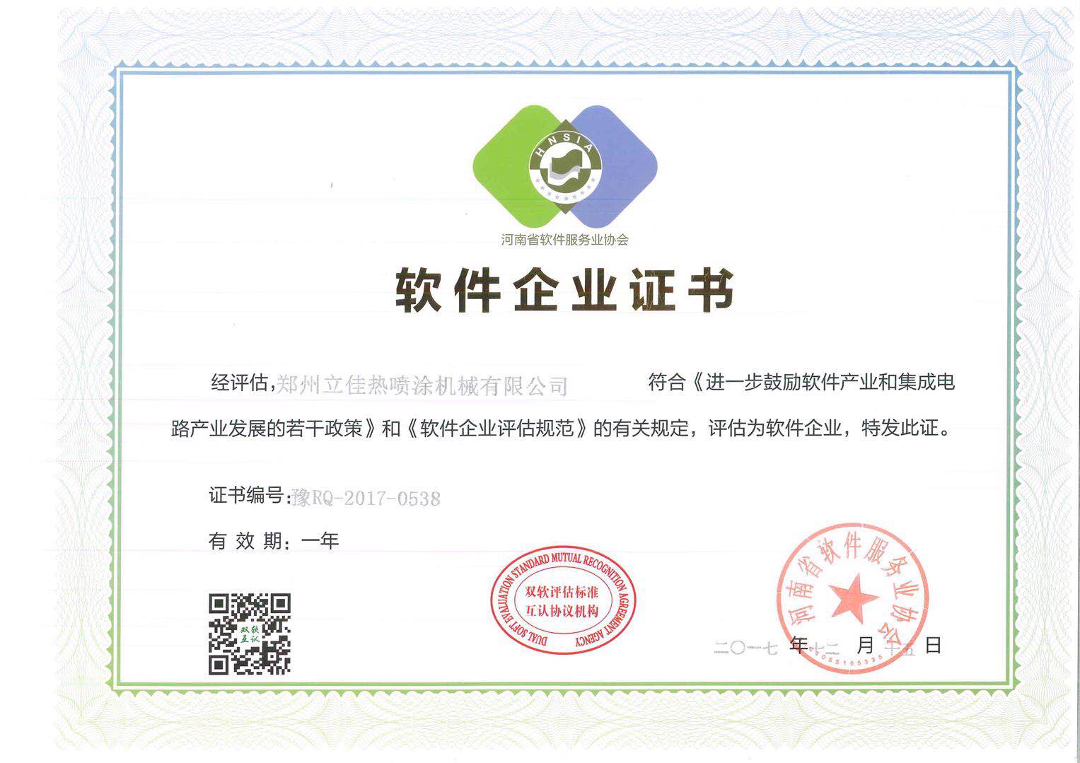 2017年12月15日河南省軟件服務協會(huì)、鄭州市(shì)發展和改革委員(yuán)會、鄭州市科技創新委員會、鄭州市國家稅務局和鄭州市地方稅務局、鄭州市(shì)軟件行業協會聯(lián)合審核批準認定,中華人(rén)民共和國工業和信息化部軟件服務業司正式備案公告,順利通過“ 雙軟企(qǐ)業認證”,正式成為(wéi)“雙軟企(qǐ)業”,“軟件企業認定證書”(證書編(biān)號:豫RQ-2017-0538)和“軟件產品登記證書”(證書編號:豫RC-2017-0489)。