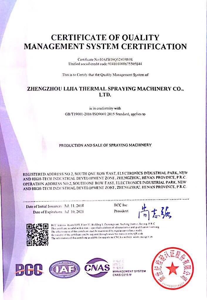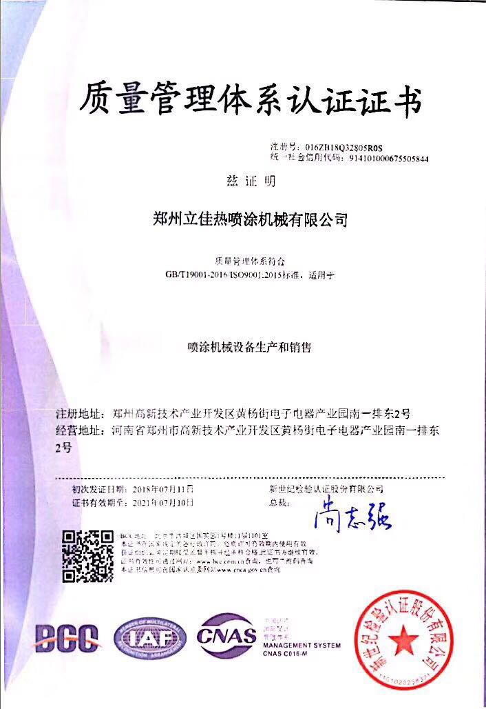 2018年7月11日,鄭州(zhōu)羞羞视频网站熱噴塗機械有限公司順利通過“GB/T19001-2016/ISO9001:2015標準”質量管理體係認證並獲得資質證書。